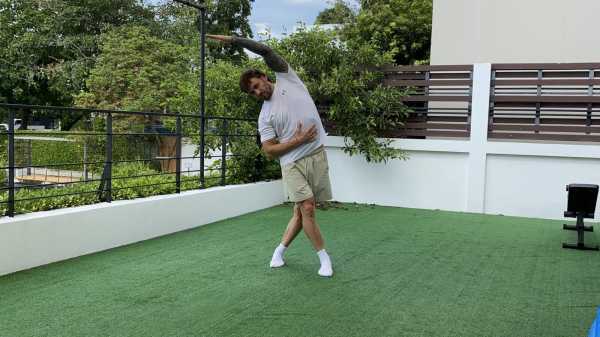 Из положения стоя делаем обратное зашагивание и выполняем наклон туловища в сторону передней ноги. Добавляем вытяжение боковой линии тела с помощью руки. Удерживаем позицию до 15 секунд в каждую сторону. Выполняем 8-10 раз в каждую сторону.