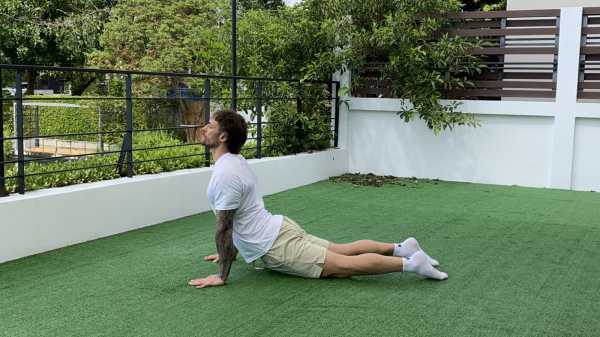 Из позиции лежа на животе выйти в позицию упор на прямые руки. Вытянуться за макушкой вверх. Расслабляем переднюю линию тела и бедра со стопами. Задержка до 15 секунд. Выполняем 10-12 раз.