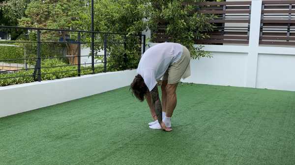 Из положения стоя (нейтральная позиция) Расслабляясь выполняем наклон вперед. Позвонок за позвонком делаем сгибание позвоночника. Движение максимально медленное. Руки висят в расслабленном положении. Колени стараемся держать прямыми. По завершению движения (макушка в пол) Выполнить разгибание в обратной последовательности, в том же темпе. Следим за плавностью дыхания. Выполняем 8-10 раз.
